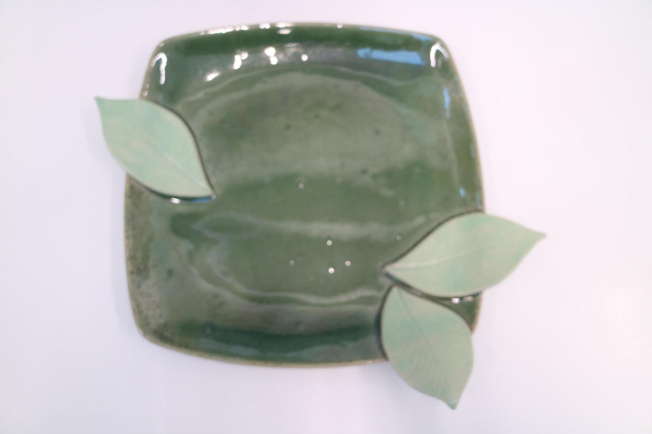 Saaremaa Kunstistuudios käsitööna valminud lehekestega roheline taldrik.